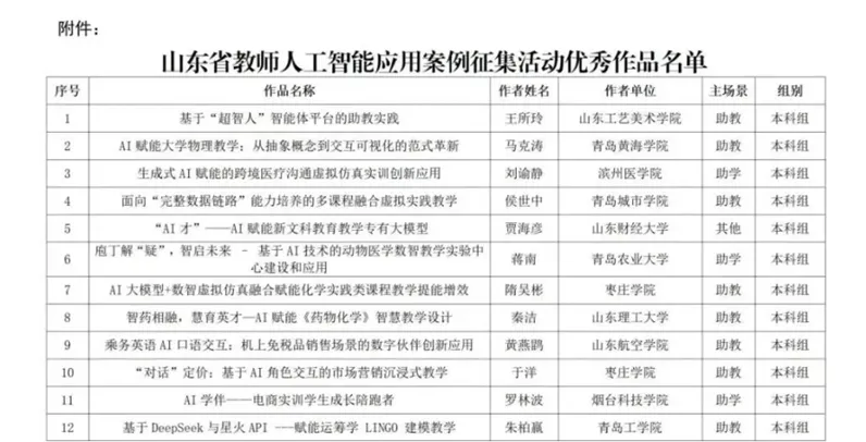 近日,山东省电化教育馆发布《关于教师人工智能应用案例征集活动优秀作品的公示》,我院王所玲老师报送的《基于“超智人”智能体平台的助教实践》案例,在全省481件各学段参赛作品中脱颖而出,位列榜首,获评省级优秀作品,充分展现了我院在人工智能与教育教学融合领域的扎实实践与创新实力。