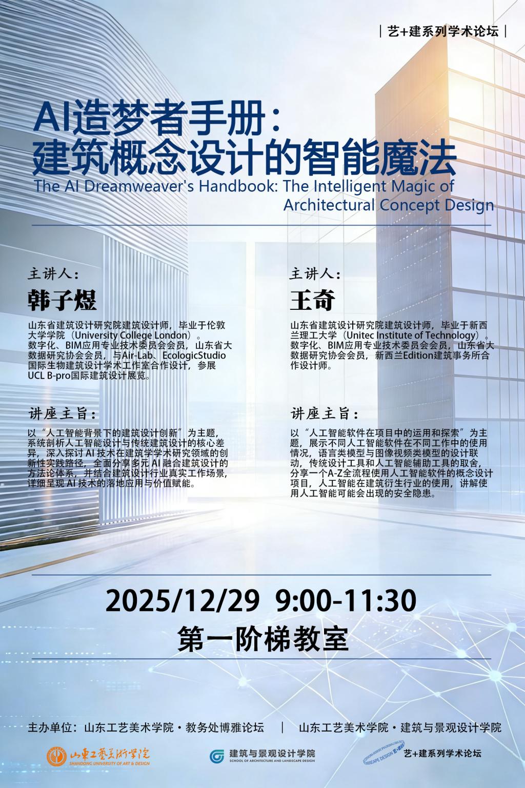 以“人工智能背景下的建筑设计创新”为主题,系统剖析人工智能设计与传统建筑设计的核心差异,深入探讨 AI 技术在建筑学学术研究领域的创新性实践路径,全面分享多元 AI 融合建筑设计的方法论体系,并结合建筑设计行业真实工作场景,详细呈现 AI 技术的落地应用与价值赋能。