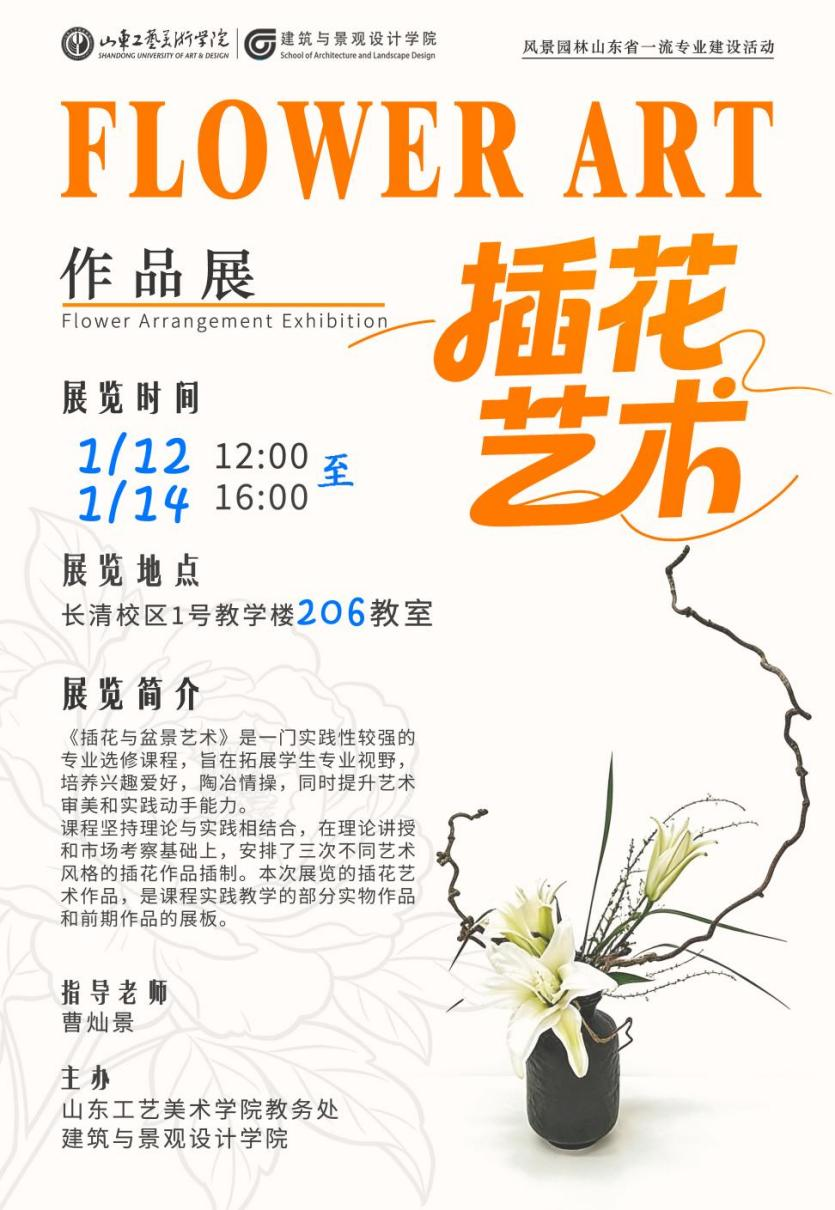 2026年1月12日,建筑与景观设计学院在长清校区1号教学楼206室举办插花艺术作品展。山东工艺美术学院建筑与景观设计学院党总支书记姬升果、副书记姜华、副院长王健、学院部分专业教师和学生参观了作品展。指导教师曹灿景向各位领导和老师介绍了课程教学和作品展情况。本次插花艺术作品展是课程实践教学的部分实物作品,展览时间1月12日至14日。