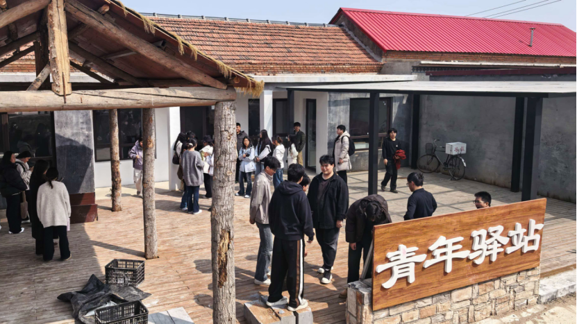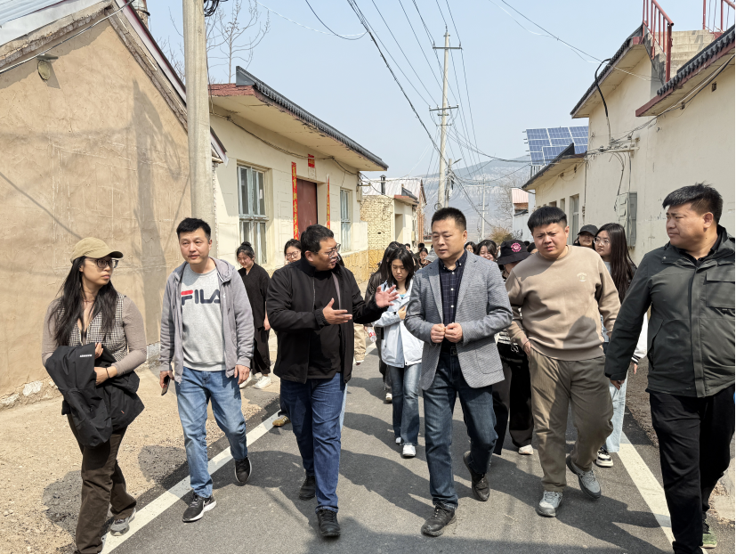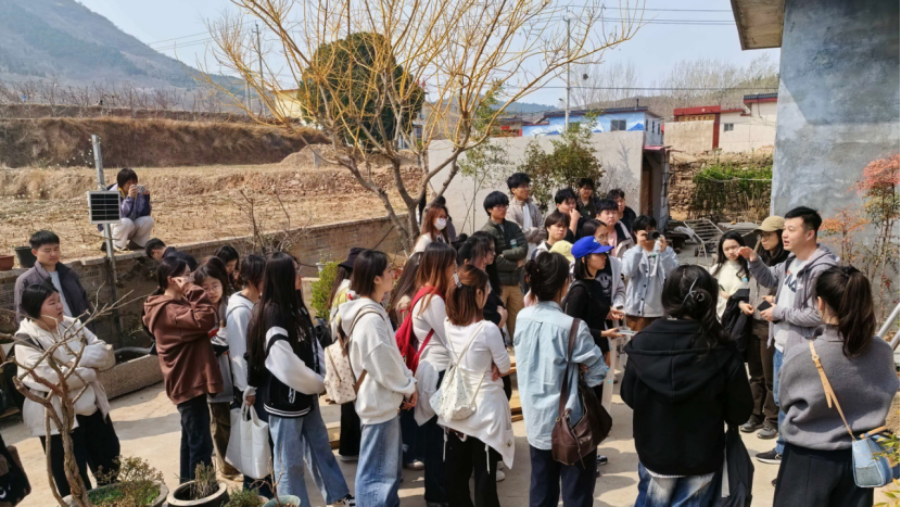 随后,师生们前往庄南山村深入调研。在老师的带领下,同学们走访农户院落,细致观察乡村空间布局、风貌特色与设计需求。师生与村干部和村民深入交流,倾听乡村故事、探寻民俗文化,积累第一手人文素材,并从乡村设计视角,分析村庄现有优势与提升空间,结合南山小院、村咖馆、数字化赋能空间等既有设施,探讨院落花艺装扮、公共空间优化、休憩设施完善等设计策略,让乡村既有烟火气,又具艺术感。