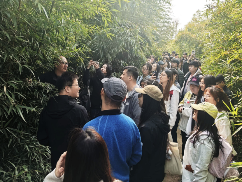 教学第一站,师生们来到幽篁里竹园。带队老师结合风景园林专业知识,现场讲解乡村文旅空间的设计逻辑,引导学生仔细考察竹林内设施布局与提升空间。根据园区发展定位,师生们积极探讨竹林露天音乐舞台建设、特色空间优化、景观节点设置、露营休闲区营造等设计方案,思考如何让竹林的自然之美与文旅功能完美融合。艺术设计方面则聚焦竹元素在公共艺术、文创设计、乡村装饰中的应用路径,用创意点亮乡村原生态之美。