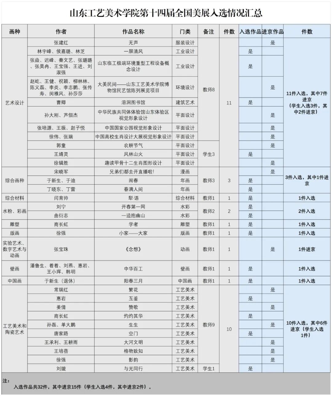 日前,第十四届全国美术作品展览各展区复评结果全部揭晓,山东工艺美术学院共有32件作品入选,其中进京作品15件,入选作品中学生作品4件,其中进京作品2件。